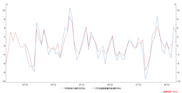 从上图可以更直观看到,2018年以前,二者的相关性很高,但是2018年下半年以后,二者的相关性减弱,但是拉长时间区间看,仍然体现出上述回归的结果特征。从2018年5月至2019年4月的1年时间,猪肉批发价上涨22.3%,CPI统计的价格上涨14.3%,二者比例为0.64,基本吻合上述回归模型中的0.66系数。